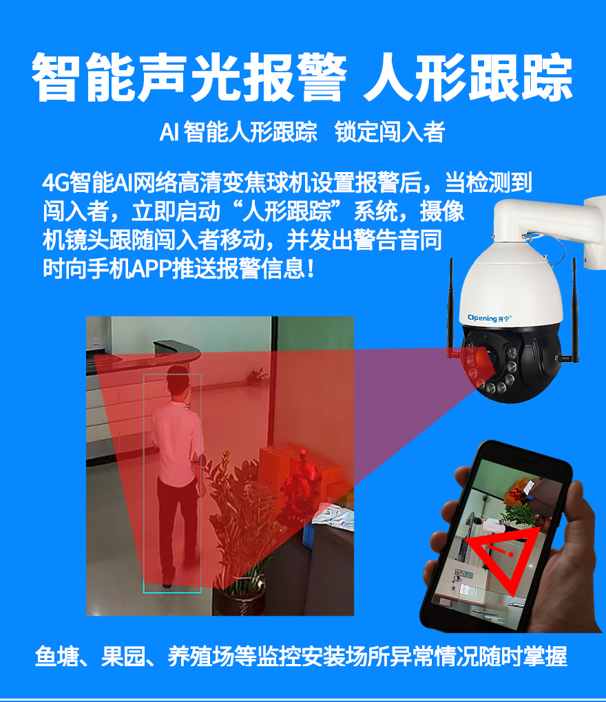 - 1、200万(1080P)4G无线变焦智能球,一个球机就是1套监控系统;