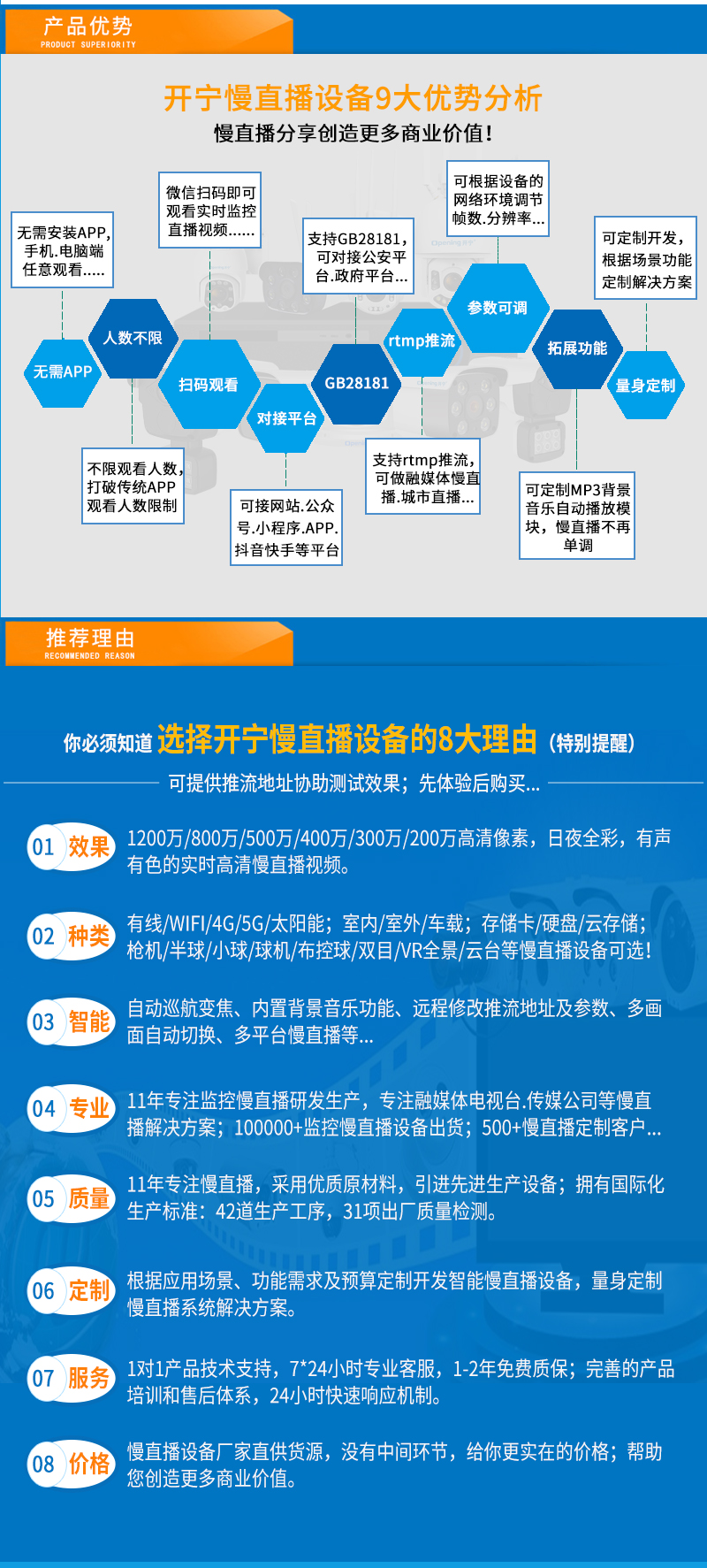 1、4G500万/4K800万4.5寸36倍双光慢直播智能球机,一个球机就是一套慢直播系统;支持360度旋转,36倍光学变焦,半金属外观,IP66防水等级; 2、内置智能4G模块,没有宽带网络的地方也能实现实时慢直播; 3、不仅可以监控监管录像,还可以实时慢直播分享创造更多商业价值; 4、美景中国.智慧景区.城市慢直播.动物慢直播.融媒体慢直播.央视频慢直播.户外直播等慢直播; 5、无需下载安装APP,简单实用;不限观看人数,创造更多商业价值; 6、RTMP推流直播高清摄像头;可生成慢直播二维码,只需扫码即可观看慢直播; 7、可接入网站.公众号.小程序.APP;可对接抖音.快手.视频号.淘宝.拼多多等平台; 8、支持GB28181协议;可接公安.食品.工地.生产.教育.畜牧.旅游等监管部门平台; 9、支持4G/WiFi/有线连接,没有宽带网络用4G流量,有宽带网络可用wifi/网线连接; 10、6颗高效能点阵红外灯,4颗高效能点阵白光灯,夜视5-100米;36倍变焦高清镜头; 11、内置高清保真拾音器,声音视频同步慢直播;DC12V供电; 12、免费提供集中管理平台,可实现集中管理慢直播摄像头,有效提高工作效率; 13、慢直播首选4K800万高清智能球机,美景中国、实景中国慢直播好帮手! 14、水平360度无限位旋转,垂直90度;水平转速40度/秒,垂直转速30度/秒;支持256个预置位 8组巡航8组扫描,支持水平扫描,2点区域扫描,随机扫描; - 点击:2169