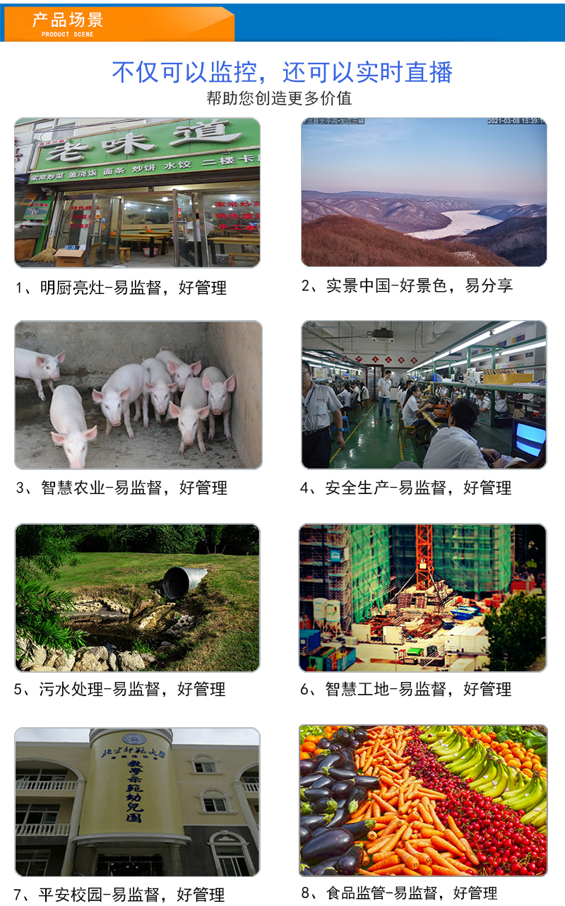 4、明厨亮灶.透明装修.智慧农业.食品溯源.实景中国.在线验厂.店铺直播.展会直播等实时监控直播;